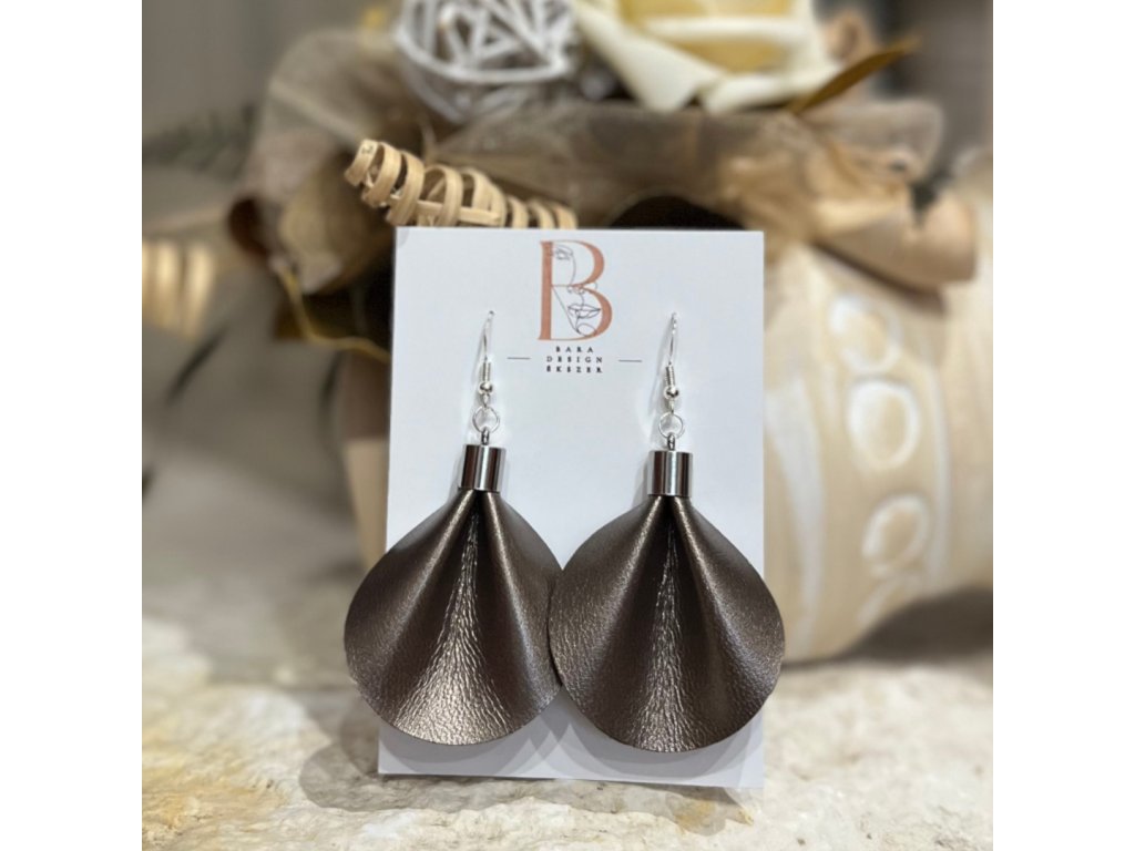 Ez a gyönyörű, különleges mintázatú fülbevaló minőségi bőrből készült, finom metál hatással. Kézzel készült darab, amely egyszerre elegáns és különleges.