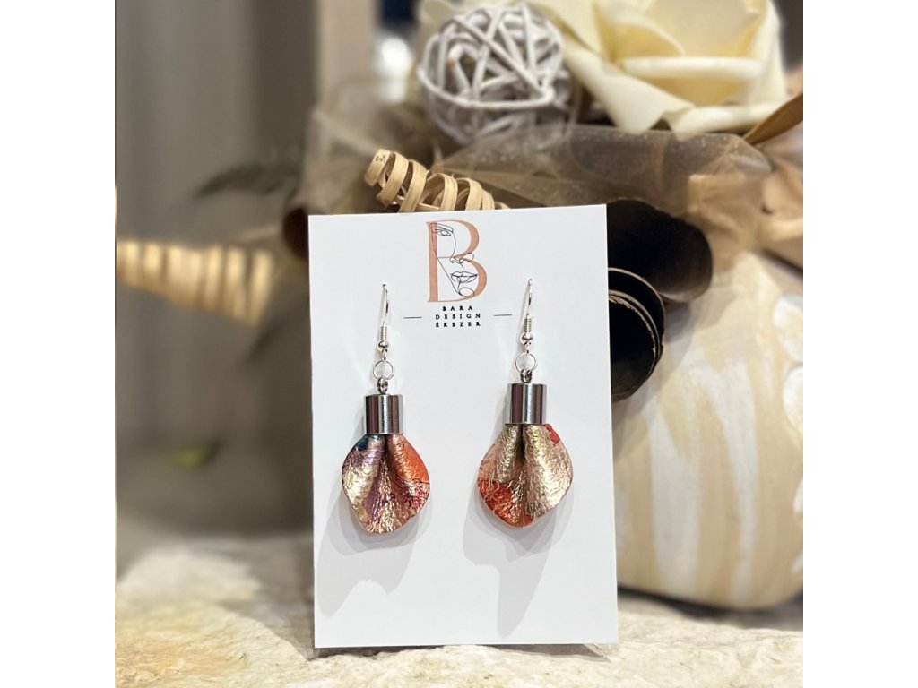 Kézzel készült bőr fülbevaló különleges metál hatású mintázattal. Könnyű, elegáns viselet arany vagy ezüst akasztóval. Hossza 5 cm. Tökéletes ajándék születésnapra, névnapra.